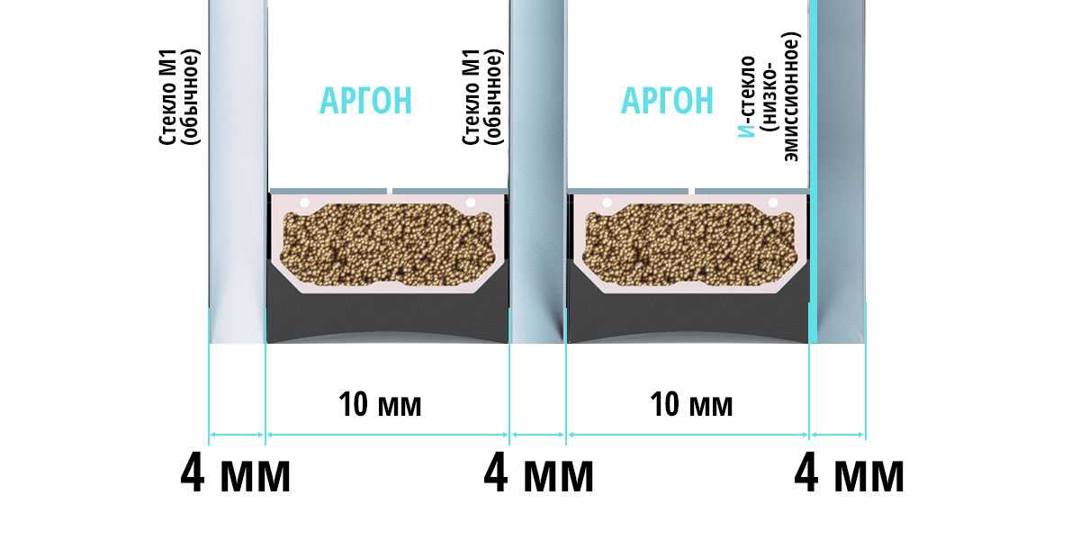 4-10-4-10Ar-4i — один энергосберегающий слой и аргоном заполнена только внутренняя камера.