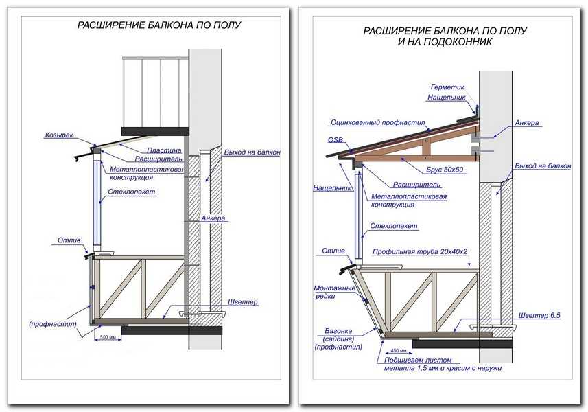 Схема расширения балкона по полу и на подоконник
