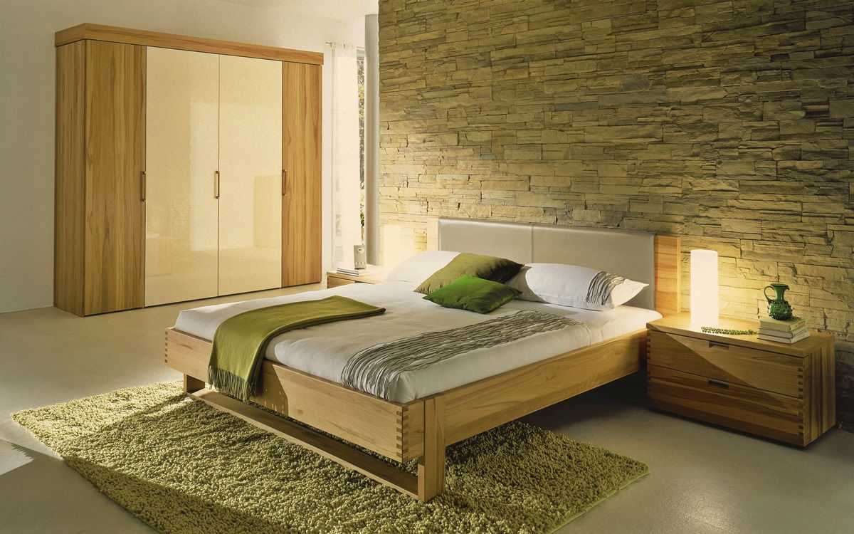 В спальне лучше не использовать каменную плитку с глянцевой поверхностью, чтоб избежать «холодного», тревожного мерцания. А фрагмент, облицованный камнем, не забудьте подчеркнуть светильниками, что сделает фактуру мягче и теплее.