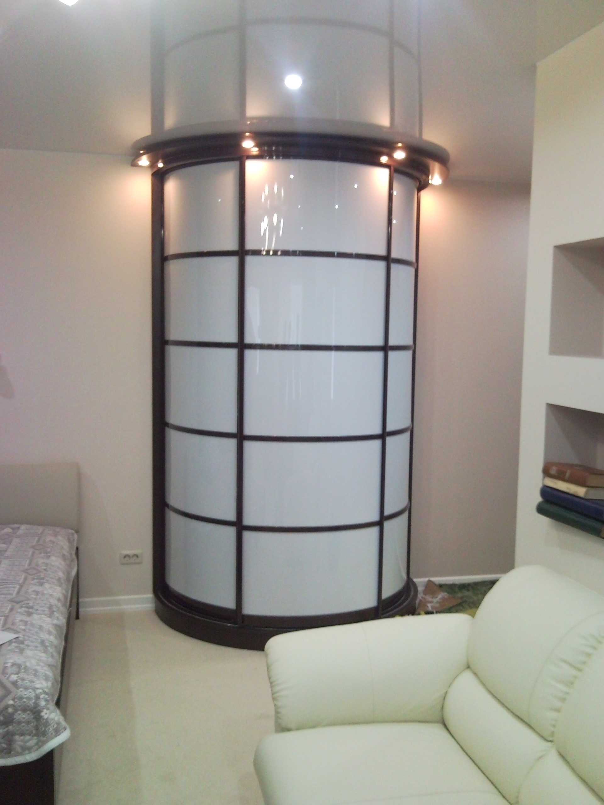 Радиусные шкафы-купе изготавливают в классическом стиле или с элементами асимметрии, что позволяет сгладить все углы. Вместительность любого типа достаточна, а внешний вид поражает легкостью, плавностью и позволяет использование даже в самой вычурной гостиной.