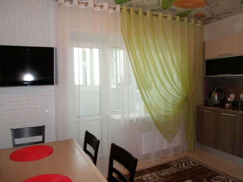 В числе новинок штор для кухни – нитяные занавески, гардина-сетка. Такие варианты весьма удачны, когда балконное окно надежно задрапировано вертикальными жалюзи или римскими шторами.