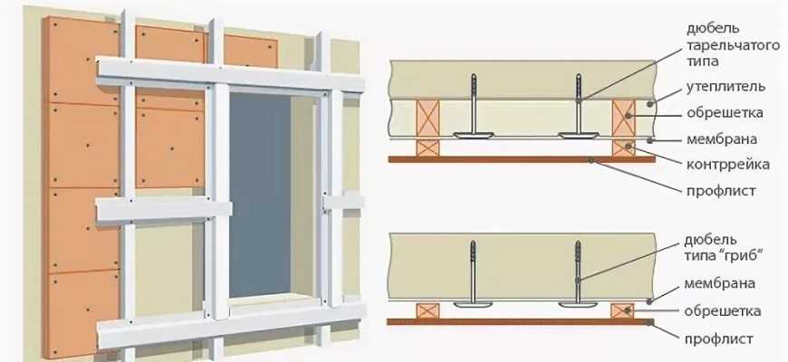 Если предполагается установка утеплительного слоя с увеличенной толщиной из пенополистирольных плит, то используют двойной каркас. Базовые планки привинчивают горизонтально, затем укладывают и крепят дюбелями тарельчатого типа слой теплоизоляции. После размещения гидроизоляционной мембраны поверх основного каркаса под углом 90° монтируют контробрешетку. Зазор составляет от 300 до 600 мм. Дополнительные планки обеспечивают вентиляцию пространства между слоем теплоизоляции и обшивкой.