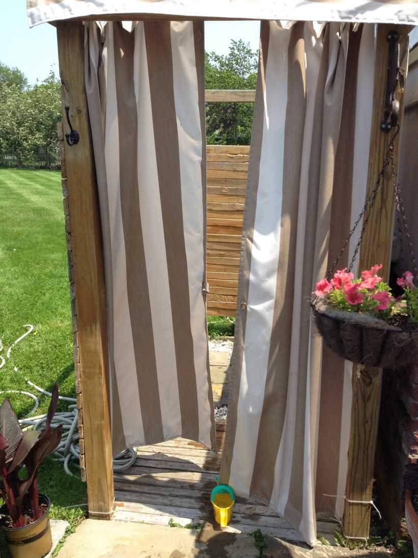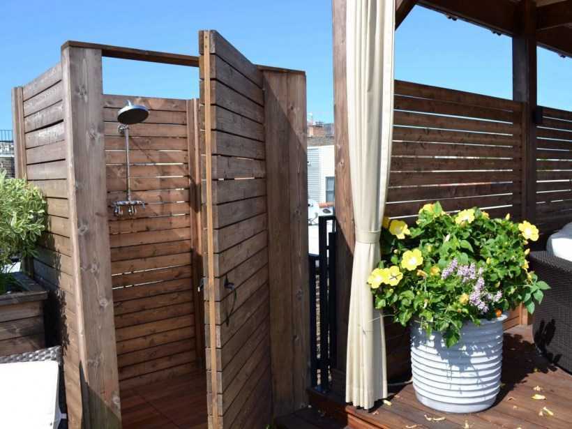 Открытый летний душ представляет собой легкую пристройку к стене дома. Именно на последней и будет закреплена накопительная емкость. Сам душ будет состоять из лейки, отведенной от накопительного бака, и шторки. Не забудьте о защите стены дома от влаги.