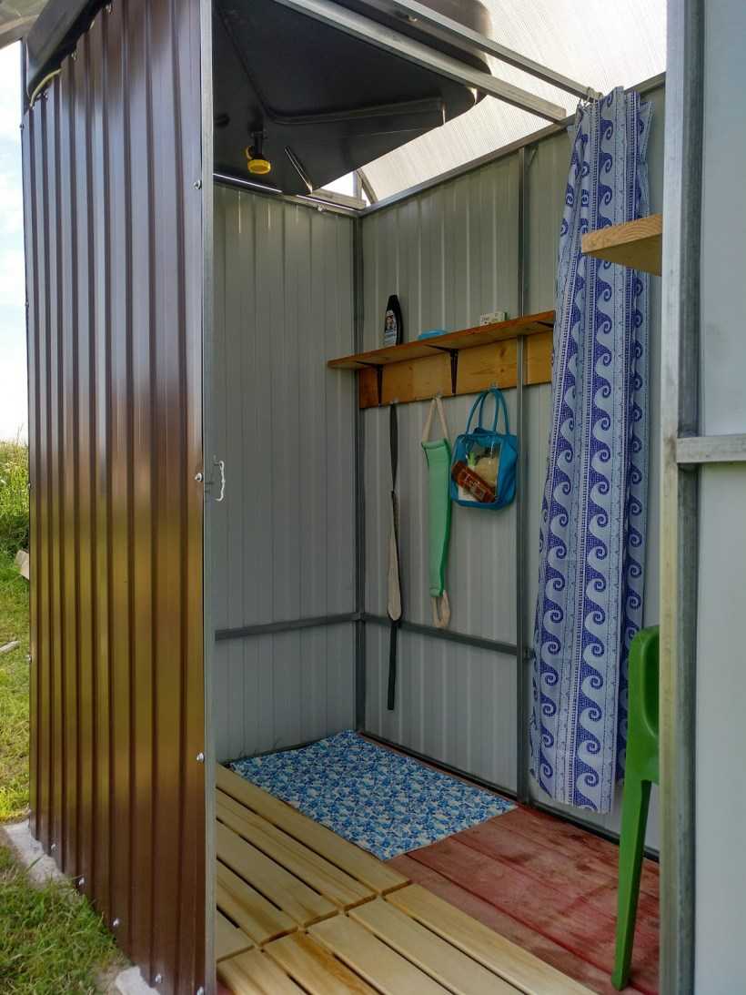 Особенно комфортно принимать освежающий душ в кабинах, имеющих в своей конструкции и раздевалку с навесом. Благодаря дополнительному помещению будет удобнее переодеться, есть возможность посидеть и отдохнуть.