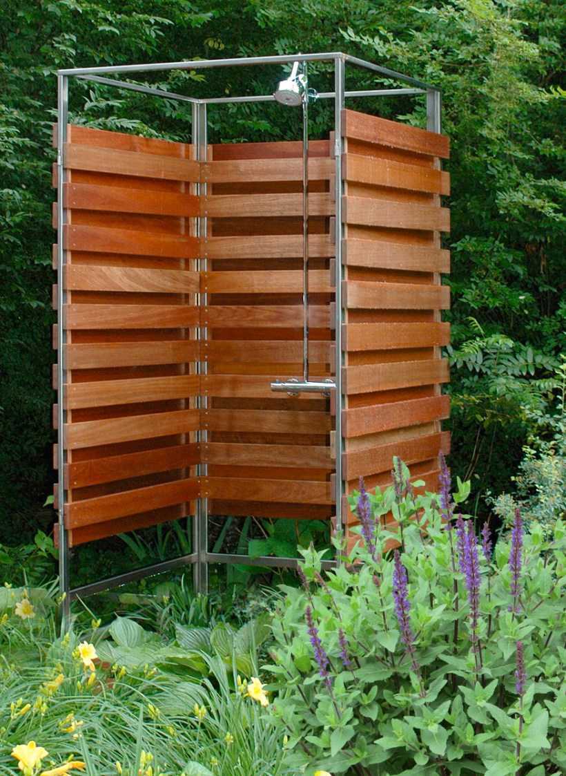 Самый простой и доступный вид – это уличный душ с водонепроницаемой ширмой по периметру. В ней все устроено довольно просто, такая конструкция подходит для того, чтобы помыться и освежиться в любую погоду.