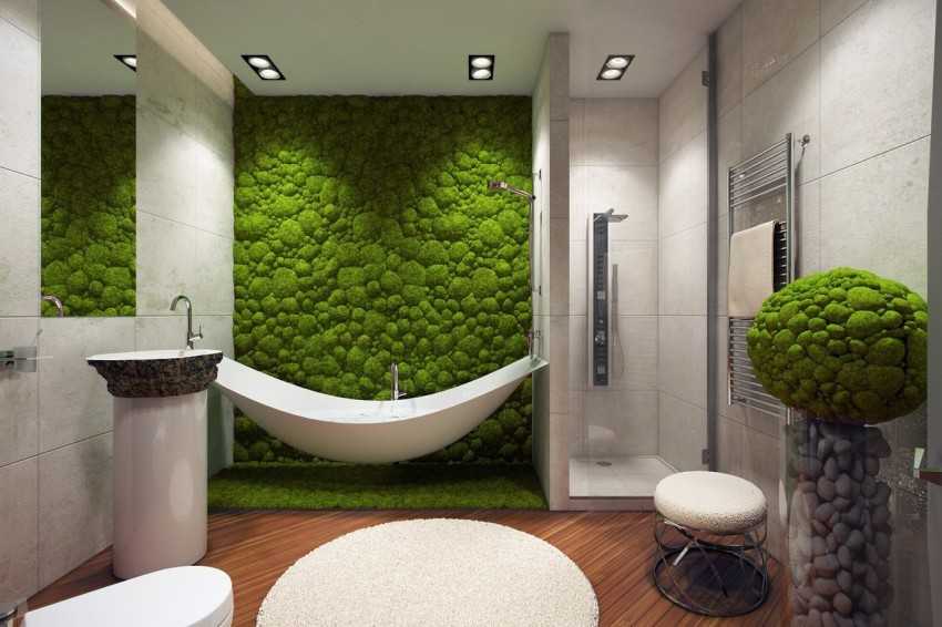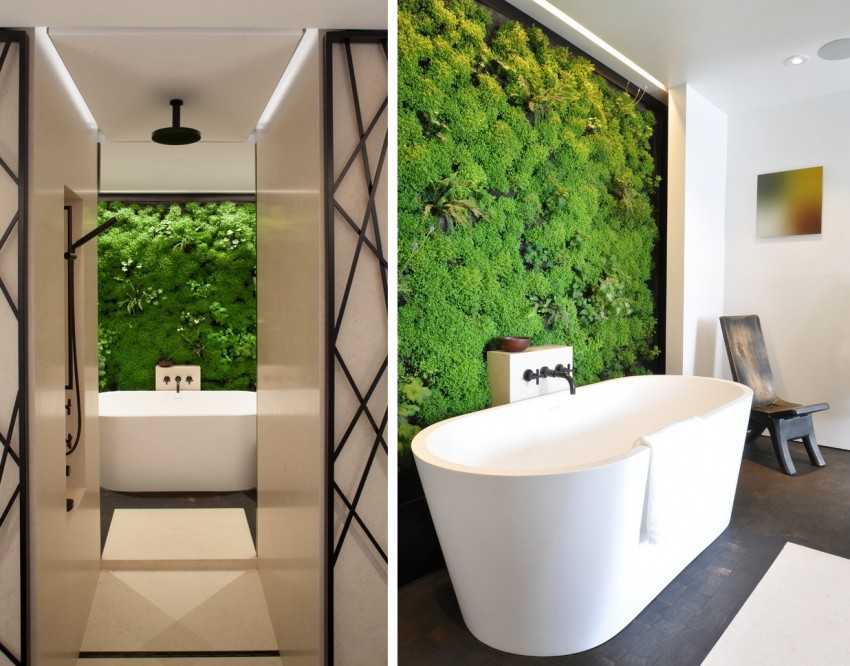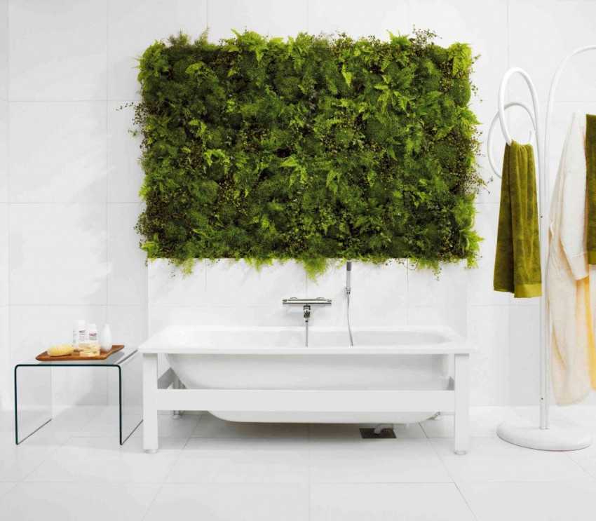 Восхитительно выглядит фитостена. Она включает в себя мох, папоротник, эписции и др. на усмотрение хозяев. Только к живой стене нужно провести систему орошения.