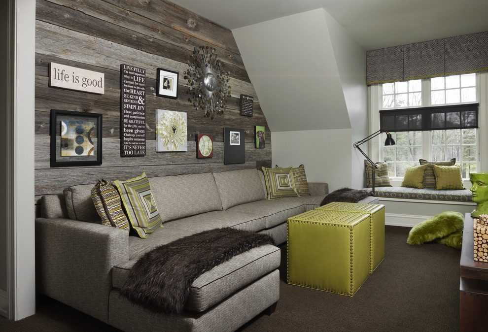 Разделение зоны отдыха и рабочего стола с помощью декора стены деревянными рейками и дощечками