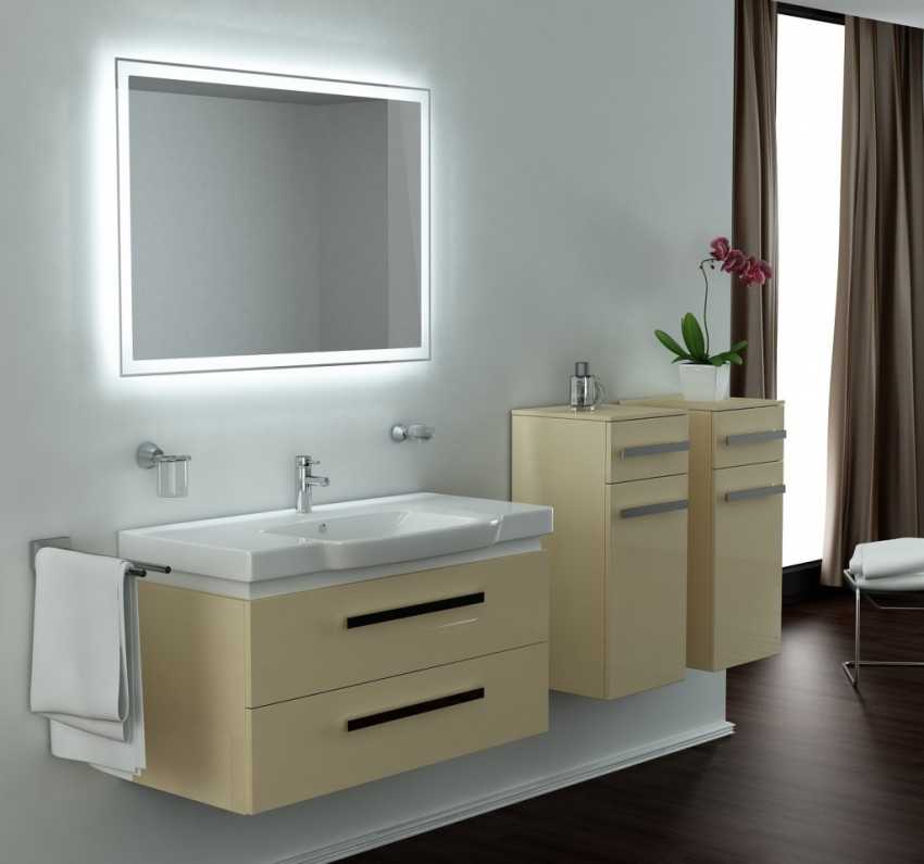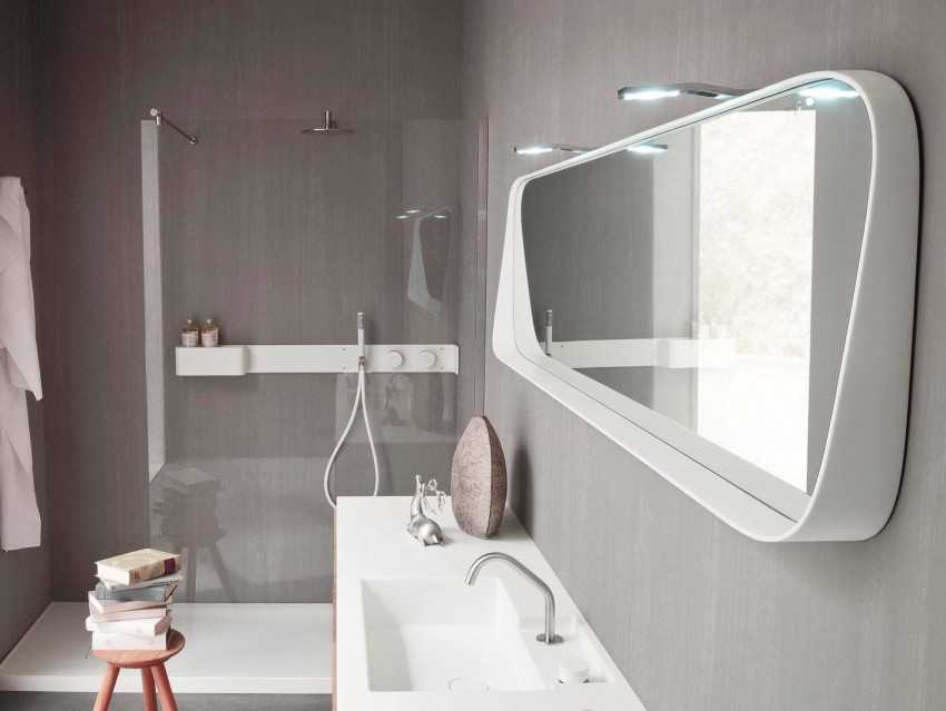 На небольшие по размеру зеркала также можно крепить источники света по периметру. Зону ванной также можно выделить при помощи освещения, для этого подойдет бра. Подсветка мебели – еще одно дизайнерское решение. В шкафы, выдвижные полки устанавливаются дополнительные источники света, которые облегчают нахождение нужных предметов.