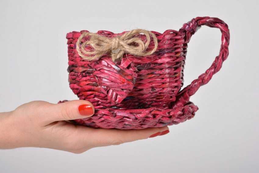 Из газетных трубочек может получиться неплохая корзина. Потребуются только газетные трубочки, клей, лак, кисть, краска.