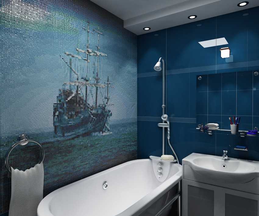 Мозаика в интерьере в качестве кафеля, стекла, пластика. Для декора ванны мозаикой можно использовать любые тона цвета, различные узоры (абстрактные, растительные, геометрические).