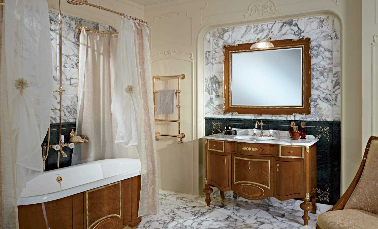 Подходит в основном только для просторных ванных комнат. Все в них свидетельствует о роскоши, высоком социальном статусе владельца. Принадлежности (мыльница, коврик, всевозможные полки и подставки) обязаны быть соответствующими. Преобладают желто-золотистые и контрастные оттенки.