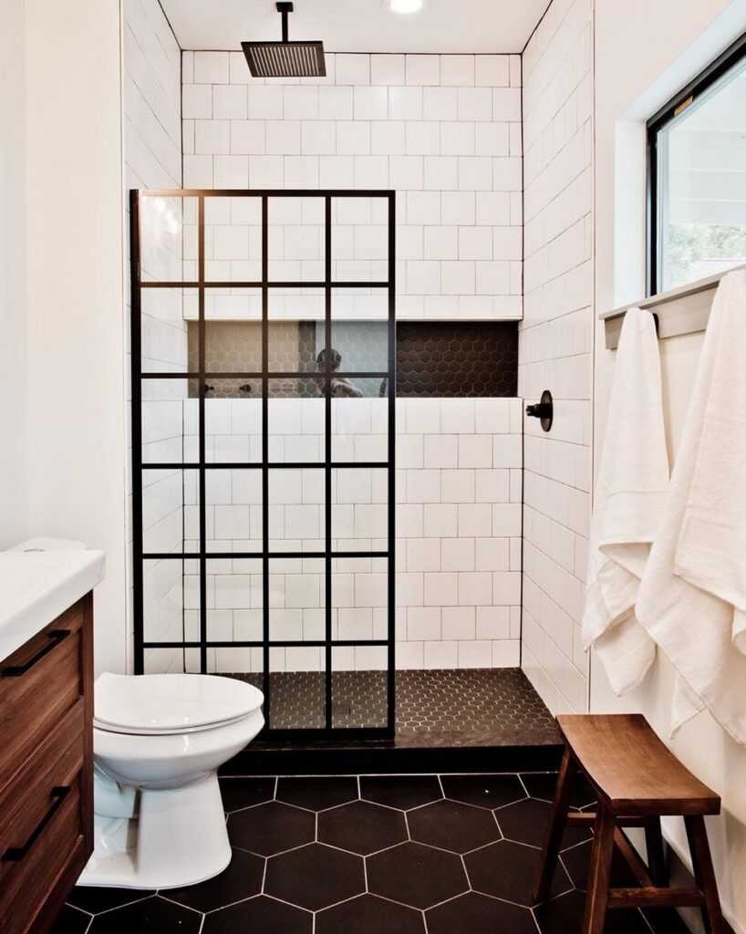За счет большого разнообразия, плитку легко комбинировать. Например, можно использовать однотонную темную плитку на полу и плитку с черно-белым узором на стенах. Такой вариант сделает помещение более воздушным.