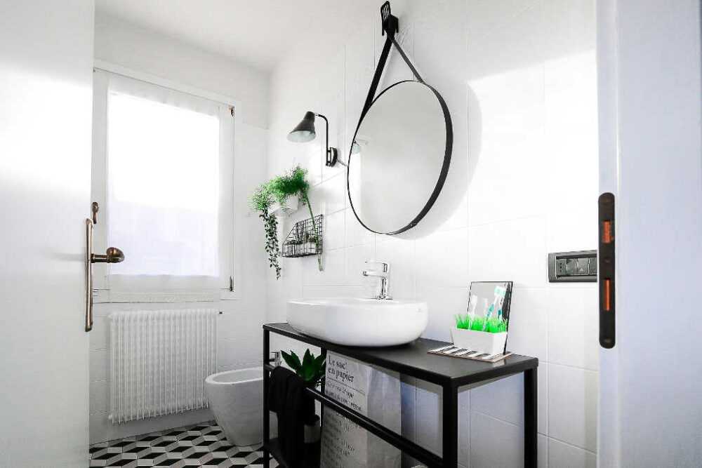 Черный цвет также может появиться в нашей ванной комнате в виде современной глянцевой столешницы, в которую встроена белая раковина или в виде фурнитуры или черных осветительных приборов и рамы зеркала.