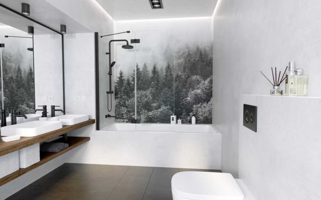Можно проявить фантазию, внести креативность и обустроить совершенно уникальное помещение с неповторимыми узорами, рисунками и принтом. Для этого могут использоваться специальные узорные плитки, различные панели или даже влагостойкие обои. В данной ситуации лучше прислушаться к советам специалистов, что позволит получить перенасыщенную и навязчивую обстановку. Следует понимать, что для достижения нужного эффекта достаточно небольшого узора, подчеркивающего и выделяющего определенную зону.