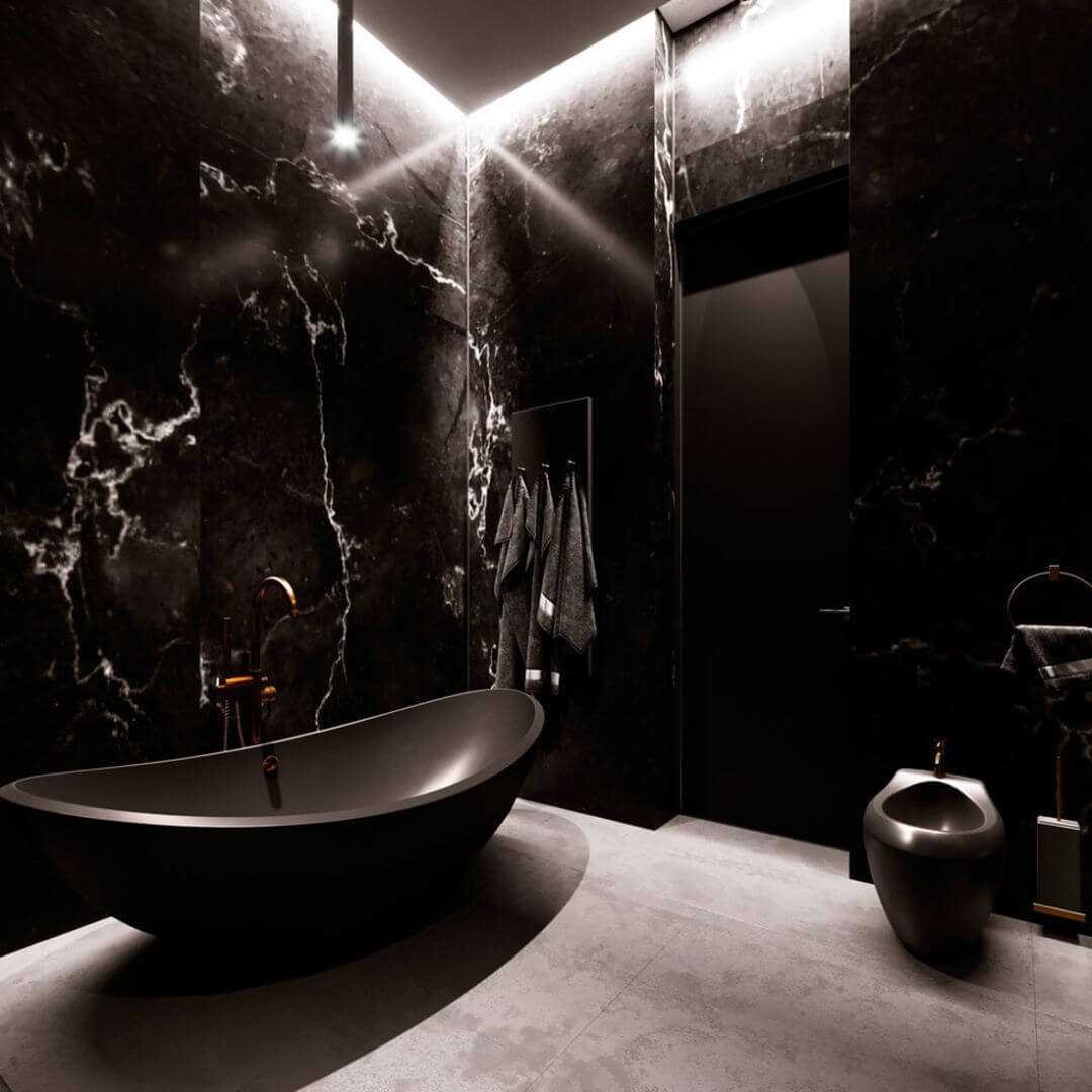 В черную ванную комнату также отлично впишутся мрамор, камень и дерево. Часть стен и потолок можно покрасить или оштукатурить