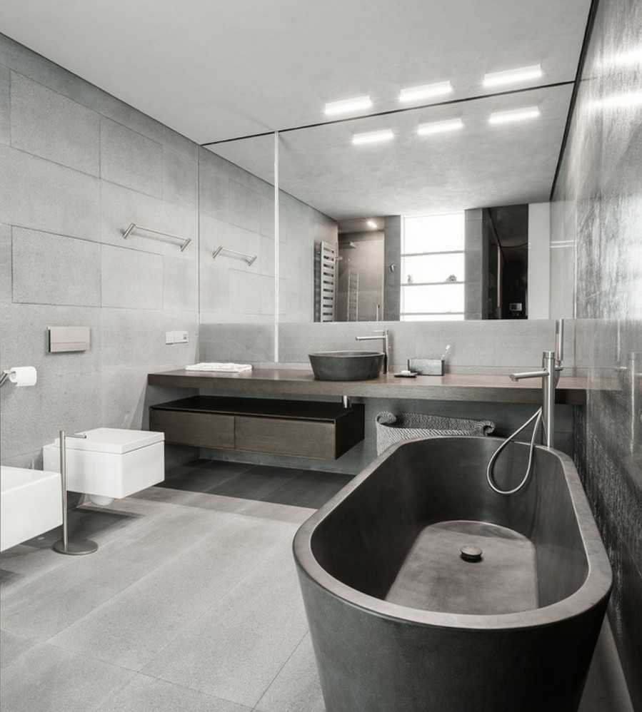 Некоторые предпочитают всю ванную комнату оформлять в спокойных оттенках. На пике популярности сегодня серые тона. В маленьком пространстве этот цвет может угнетать. Однако если помещение просторное, такой вариант будет смотреться сдержанно, но стильно.