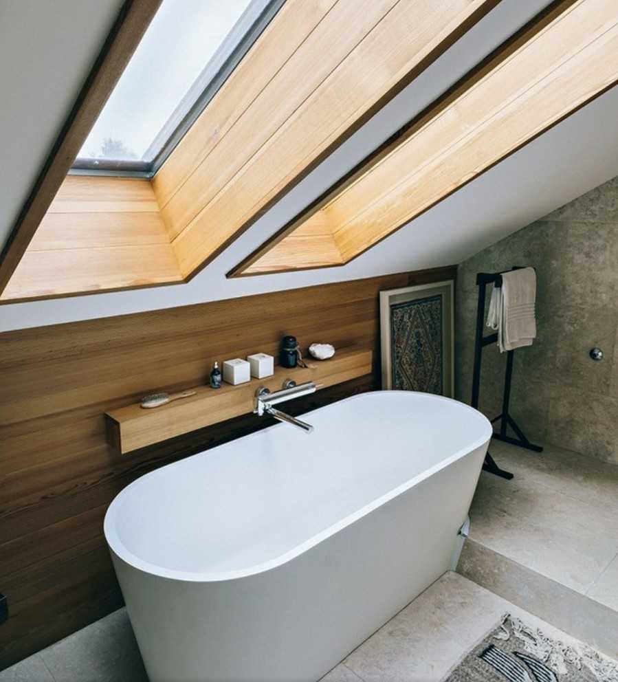 Первый пример – это комната на мансарде. Несмотря на низкие потолки, она получается удобной в использовании. Стены и потолок помещения полностью отделаны древесиной, а пол и ванна остаются кафельными. Украшают помещение такие декоративные мелочи, как полки с косметикой, живые цветы и полотенца. Комната получается уютной и располагающей к отдыху.
