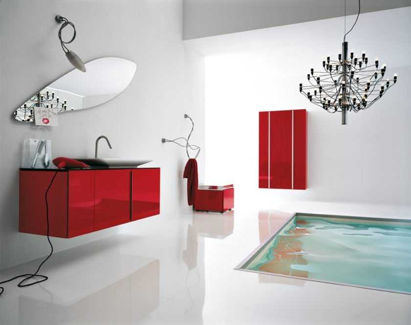 Если вам сложно вставать рано и утренний душ должен максимально бодрить, можно выбрать яркий оттенок. Конечно, если оформить все помещение в красных, насыщенно-желтых или ярко-фиолетовых тонах, интерьер может стать слишком агрессивным и раздражающим, а вот если скомбинировать сочный тон с более спокойным, может получиться весьма удачно.