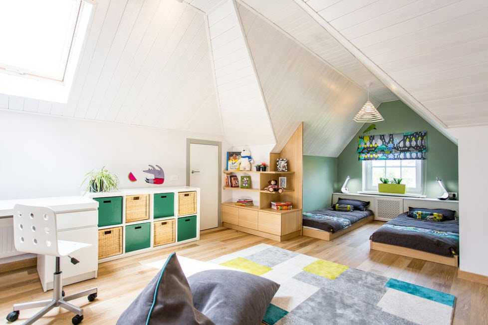 Детей и подростков можно порадовать подвесными кроватями или горками вдоль перил лестницы.