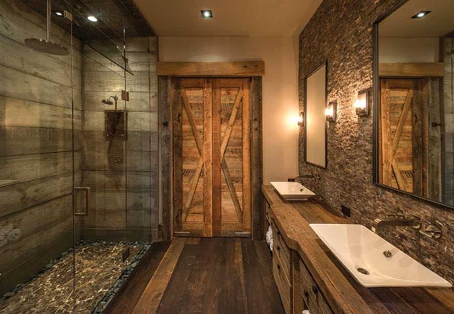 В деревянном доме можно сделать оригинальную ванную в стиле кантри. Стены из темного дерева, пол, выложенный плиткой и каменная раковина позволяют наслаждаться натуральными материалами в интерьере и ощущать себя частью природы.