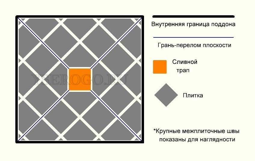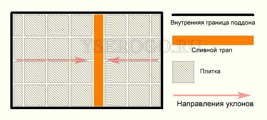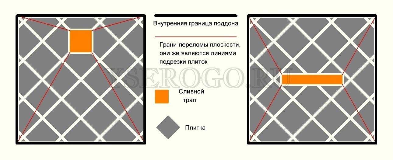 квадратного или прямоугольного трапа. Из этого вытекает данность, что плитку придется подрезать на гранях-переломах, исключением является квадратное дно поддона с