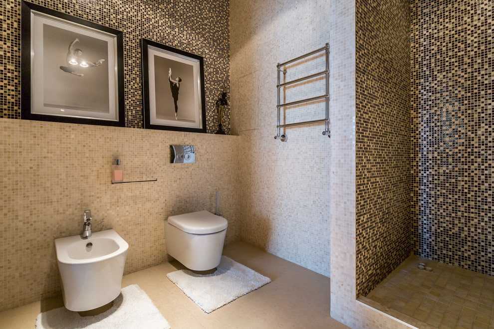 Данная комбинация позволяет создать действительно интересную отделку душевой. С помощью добавления такого характерного штриха, как мозаика, обстановка приобретает более продуманный и завершенный облик.