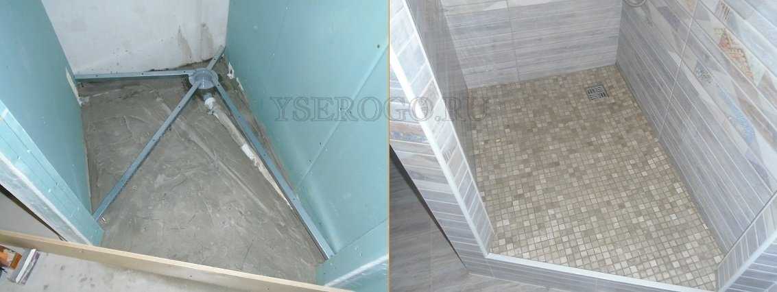 случае лучше всего остановить свой выбор на мозаике. Какую бы форму не имел поддон, нужно свести четыре (или больше) маяка с одного уровня из углов сторону трапа (как на фото выше с мозаикой). Это довольно универсальное правило. Уклон в 1-2 сантиметра на метр создается по самому длинному маяку, по более коротким маякам уклон будет больше,
