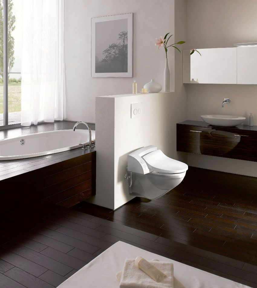 Крышка для унитаза с функцией биде. Душ встраивается непосредственно в крышку, туда же при желании монтируется фен, форсунки и прочие блага. Чаще всего такая система работает от электричества и управляется специальным пультом. Несмотря на массу положительных качеств и возможность установки такого приспособления практически на любую модель унитаза они не пользуются большой популярностью у обывателей из-за высокой стоимости прибора.
