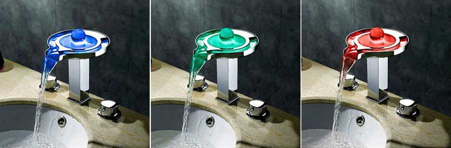 Очень удобны в ванной смесители со светодиодной подсветкой, особенно, когда излив и рычаг выполнены из стекла. В темное время работающий стеклянный смеситель водопад создает таинственную атмосферу. Светодиодная лампа меняет свои цвета с зеленого (0-30 °C) на синий (30-40 °C) и на красный (40-50 °C). При температуре свыше 50 °C, подсветка мигает. Встроенная лампа работает на батарейках, но в комплекте они не идут.