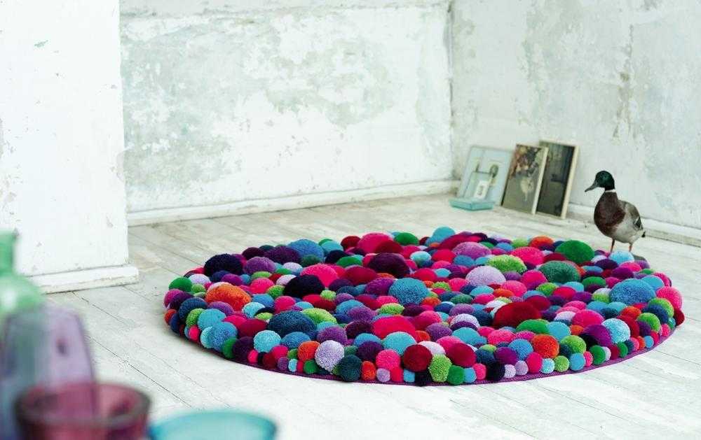 Коврик из помпонов внесет яркие позитивные нотки в интерьер любой ванной комнаты. Если в доме скопилось много разноцветных клубков, то можно употребить их на такое изделие.