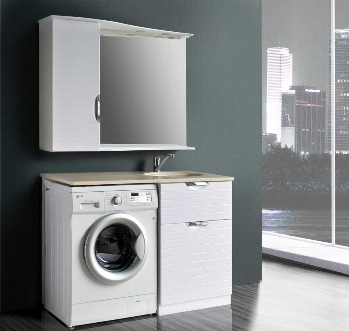 Чаще монтируют вертикальный шкаф-пенал. В горизонтальном варианте конструкция будет включать столешницу с раковиной и корзину для грязного белья. Гибкие шланги, фильтры, кран аварийного перекрытия подачи воды будут находиться в защитном коробе.