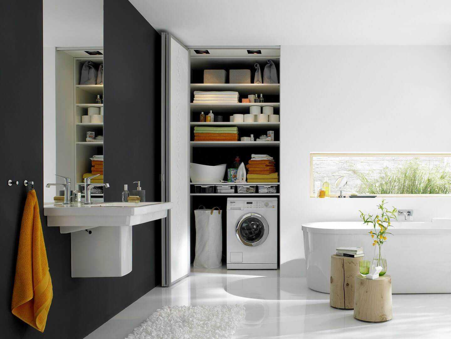 Никакая другая комната так не ассоциируется с чистотой, как ванная. Самый удобный способ – поставить в нише. Если планировка ванной не предусматривает такое удобство, из гипсокартона и плитки или купить шкаф с отделением для стиральной машины. Это пространство можно использовать по полной: установить полки или настенный шкафчик для хранения ванных принадлежностей, полотенец и прочих полезных вещей.