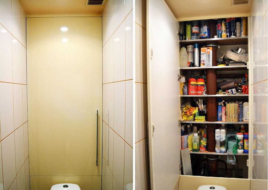 Шкафчик подвешивается над унитазом. Как правило, в нем хранится бытовая химия или наполнитель для кошачьего туалета. Если выбрать более объемную модель, то в шкаф вполне можно уместить бойлер или стиральную машину. Интересным вариантом будет вертикальный шкаф от пола до потолка, в котором спрятаны трубы и стояк.
