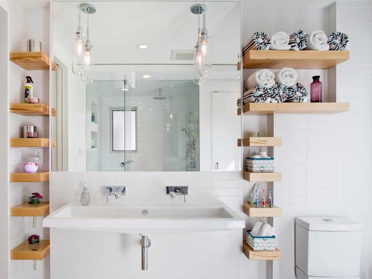 Разумнее всего поместить полки со всем необходимым вблизи тех мест, где они чаще всего используются. Всевозможные средства для гигиены или ухода должны располагаться рядом с раковиной или ванной. Причем на таком расстоянии и высоте, чтобы это было максимально удобно. Даже если сначала кажется, что один или два шага в сторону не доставят затруднений, при каждодневном использовании ненужные движения покажутся утомительными.