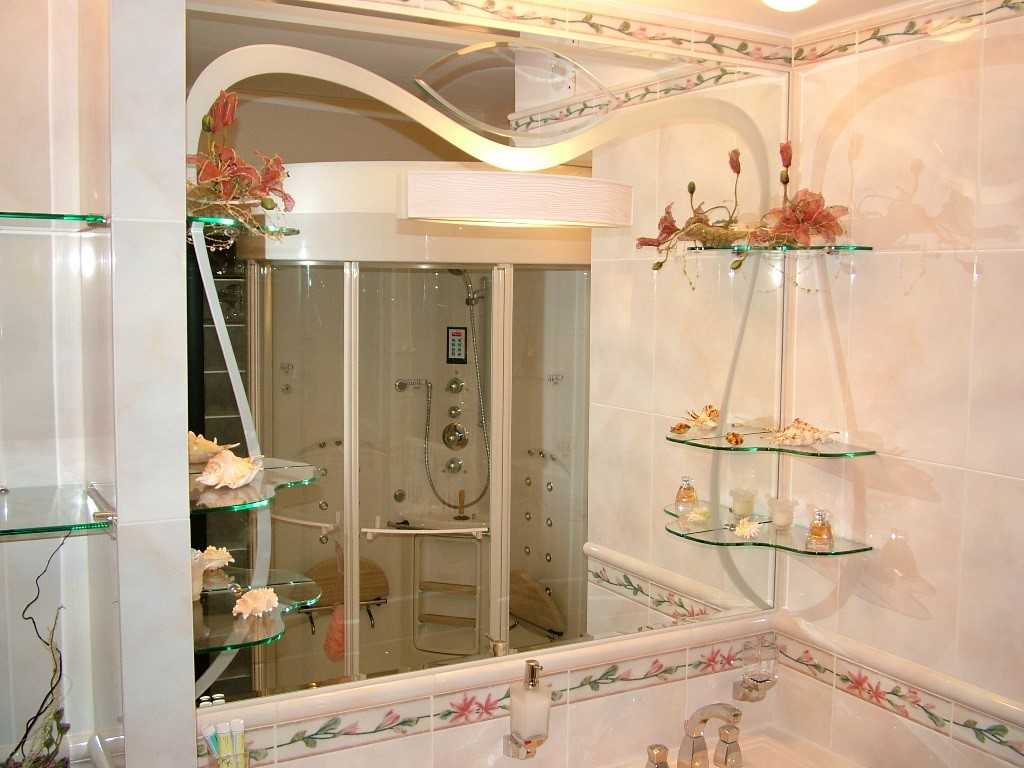 Практичная полка размещена между двумя стенками в кабине. Чаще всего из стекла или металла, с хромированной отделкой, предотвращающей ржавчину. Его можно установить на любой высоте, это позволяет сэкономить место в салоне.