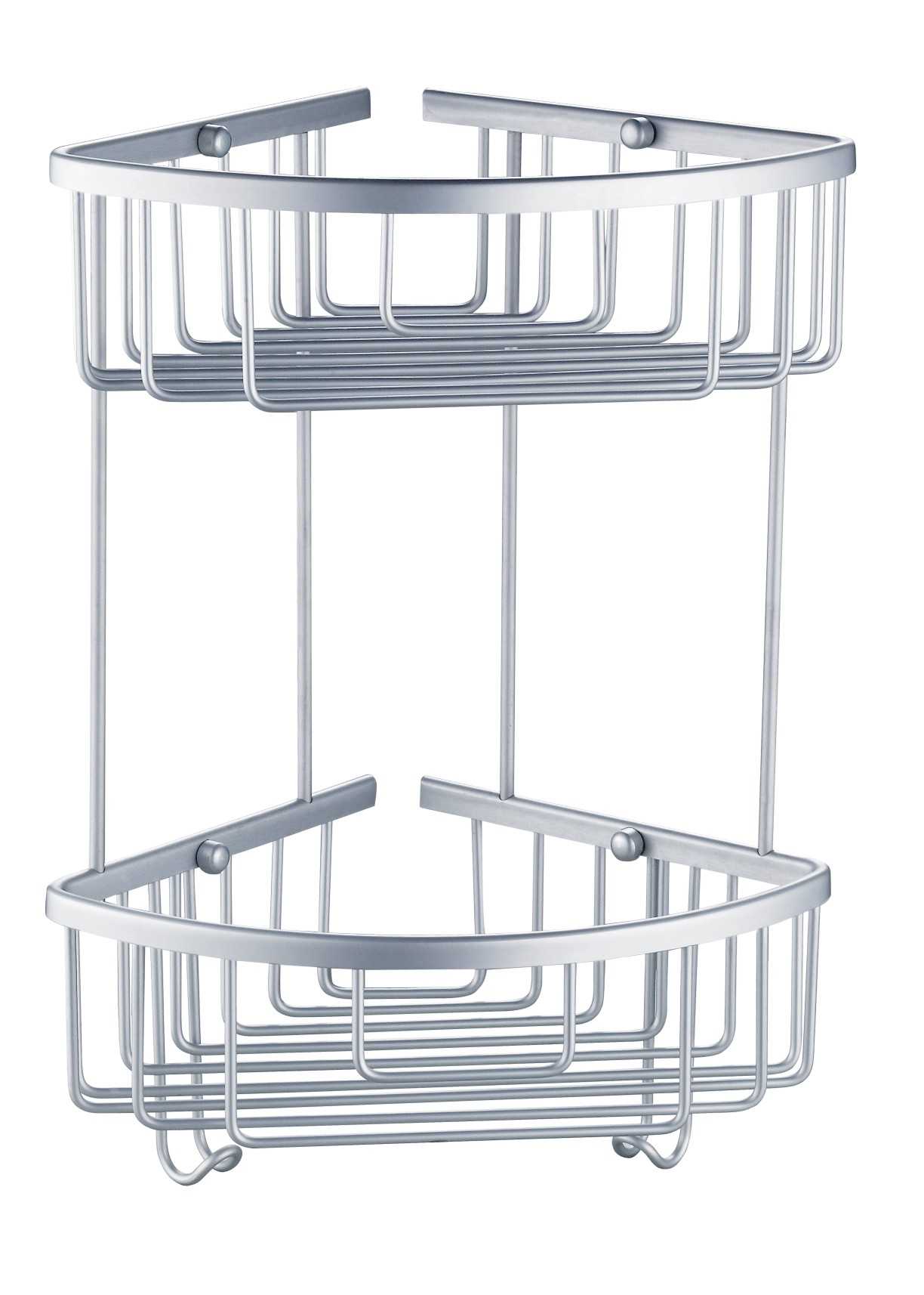 Угловые конструкции предпочтительны для эксплуатации в маленьких ванных комнатах. Они не занимают много места, выглядят очень аккуратно. Довольно часто полки углового типа вешают над стиральной машиной и чашей ванны. Традиционно в угловых моделях присутствует несколько ярусов с изящным ограждением из металлических решеток и перфорация дна полок.