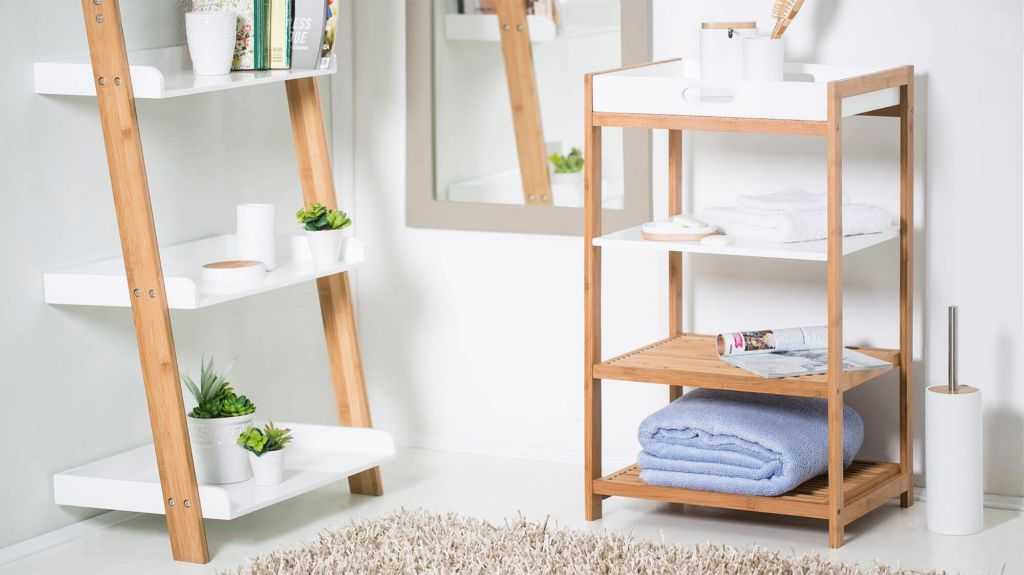 - Стеллажи по форме напоминают этажерки, только имеют более крупные размеры. Соответственно, монтаж стеллажей производится в ванных комнатах большой площади.