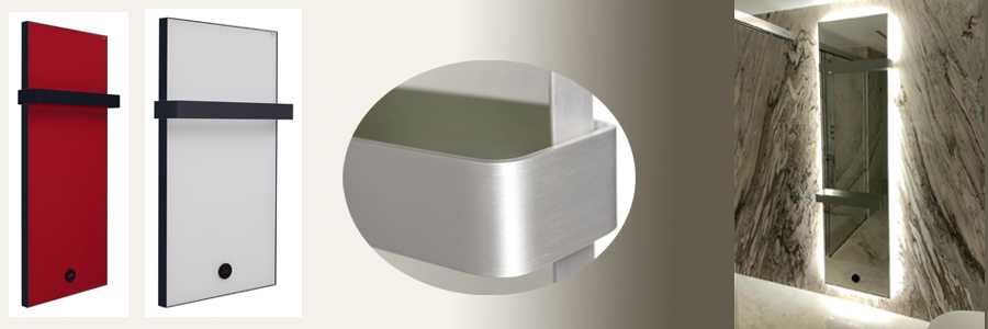 Глядя на зеркальную панель De Aquа, трудно угадать в ней полотенцесушитель. Термоэлементы спрятаны внутри, снаружи цветное стекло, витраж, искуственный камень — по желанию заказчика: http://www.deaqua.ru/magazin-deaqua/polotentsesushiteli.