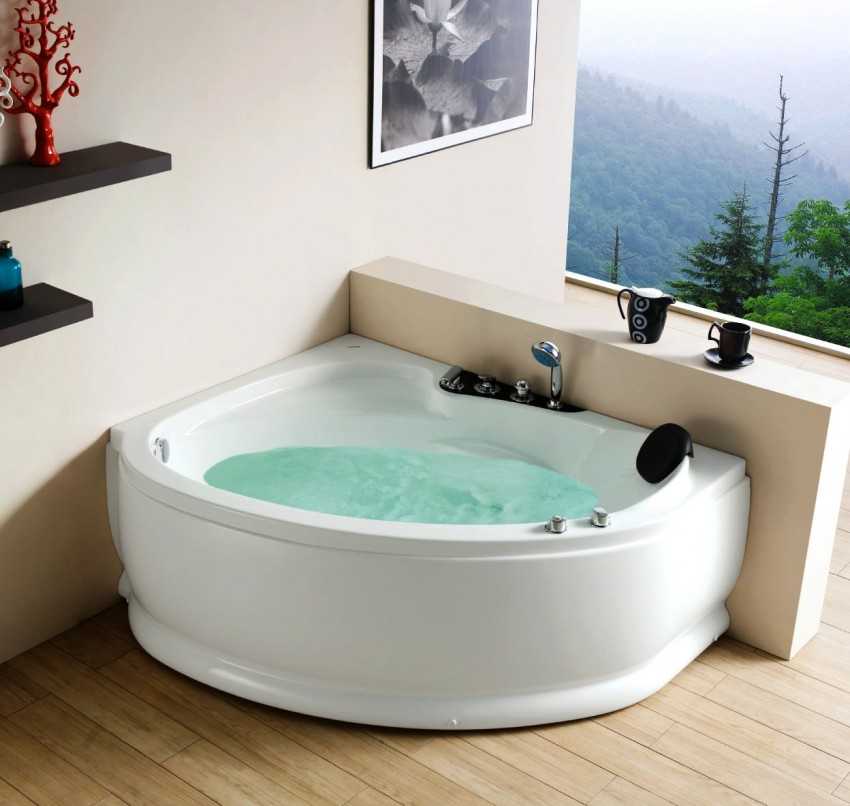 Еще один популярный среди покупателей тип геометрии ванн – угловой. Топологически такой объект идентичен прямоугольному треугольнику, у которого катеты примыкают к стенам, а гипотенуза имеет неровную выпуклую форму.
