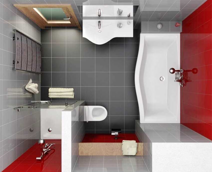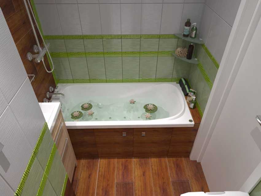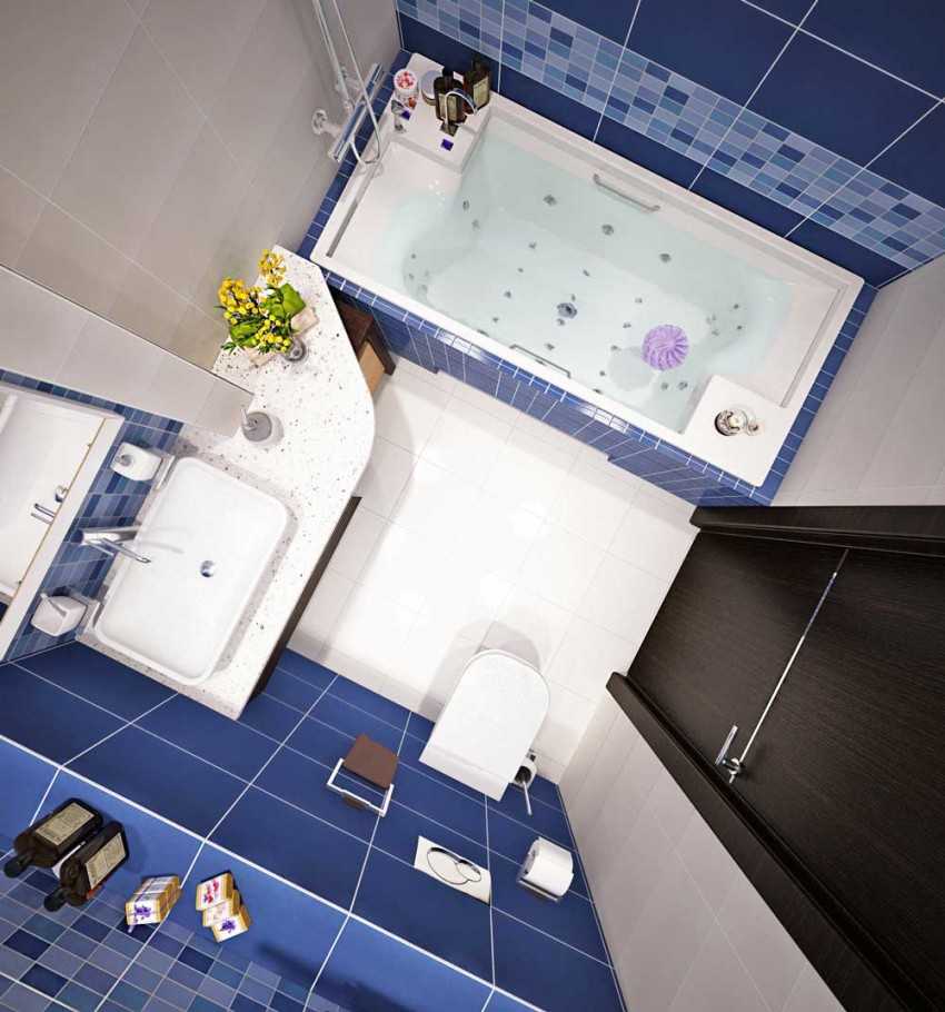 Ванну в 4 кв. метрах лучше установить прямоугольную во всю длину короткой стены. Треугольная ванна хорошо обыгрывается с угловым унитазом, расположенным по диагонали. В редких случаях используют три угла, подключая еще угловую раковину. Такой интерьер выглядит самобытно и эффектно.