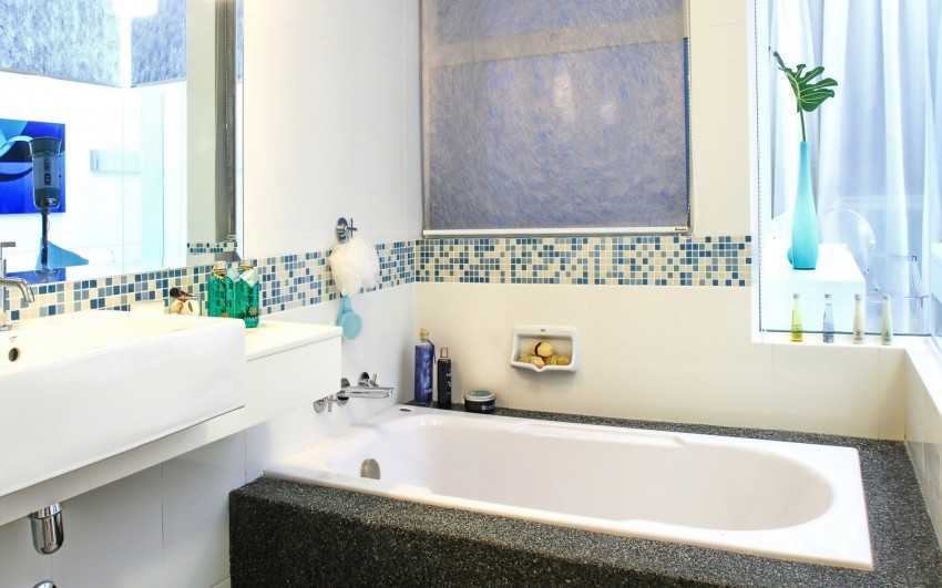 Керамогранит имеет большую площадь. Работать с ним легче, нежели со схожими материалами. Но стоит подготовиться к большим отходам. Оформить можно пол и стены идентичным оттенком и размером. Мозаика отличается долговечностью. Подходит для круглых участков, включая арку и выступ. Светлые тона наполняют помещение легкостью, прохладой и прозрачностью. Можно выбрать изделия, где сочетается несколько тонов одного цвета в разных вариациях.