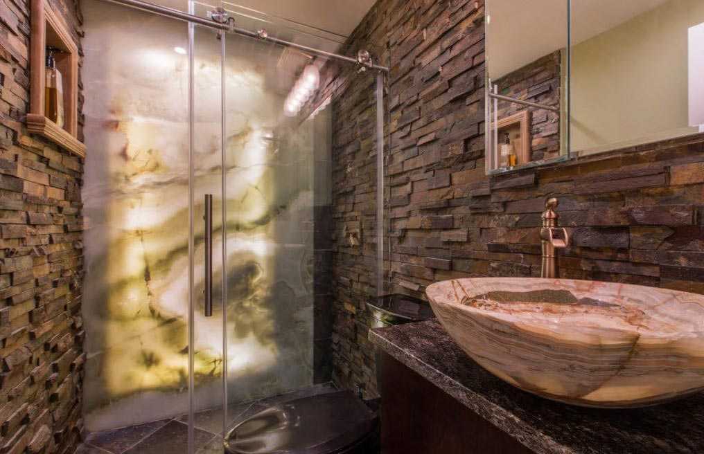 Камень — востребованный материал в отделке современных ванных. Он отличается прочностью, долговечностью, устойчивостью к воде, температурам и механическим повреждениям. Красиво смотрятся виды камня с натуральным рисунком. С розовым хорошо сочетается серый гранит или сланец, песчаник, шпон. В некоторых стилях будут уместно выглядеть имитации гальки или кирпича.