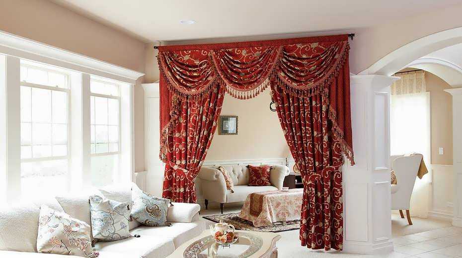 Установка шторных полотен в гостиную добавляет уюта и нежности. Они выступают не только для украшения, но и для функционального разделения. В классике шторы на арку смогут сэкономить на заказе дверец нестандартного размера. Для удобства материю подцепляют ламбрекенами с бахромой.