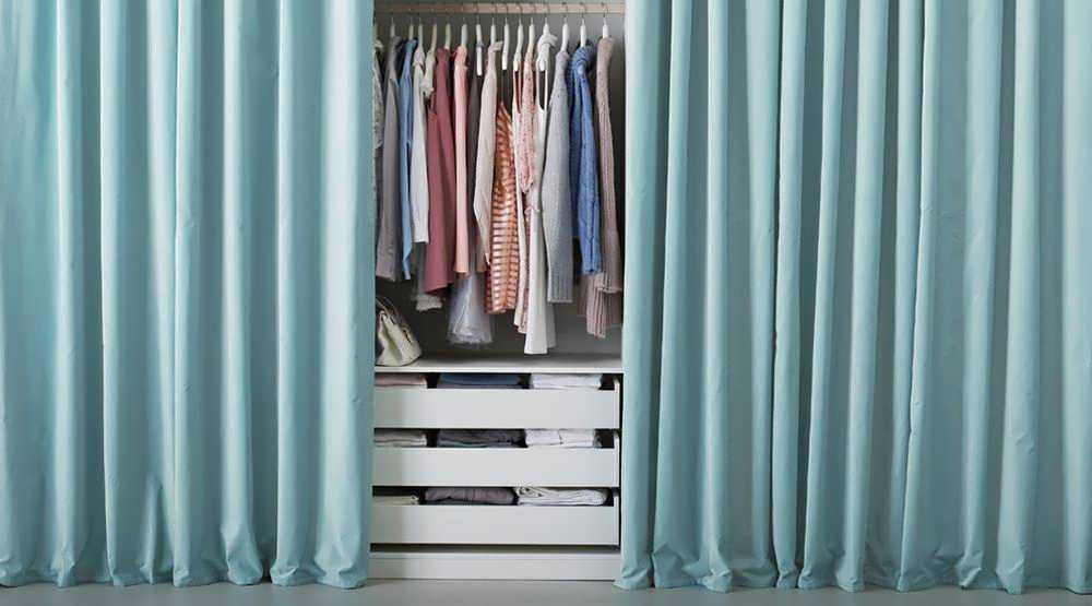 Современное оформление дверного проема гардеробного помещения выполняется плотными моделями. Портьер не должен пропускать световые лучи и позволять увидеть наполнение полок.