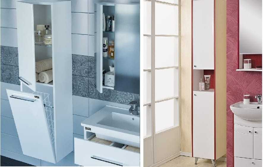 Если речь идет о шкафах-пеналах, то они чаще всего представляют собой узкую конструкцию, их ширина составляет 20 см и более. Многие любят размещать их в паре с обеих сторон умывальника.