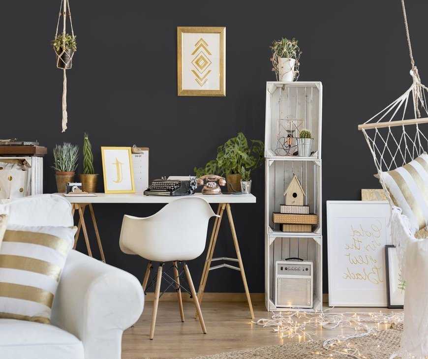Кажется, что строгий и минималистский стиль исключает утонченную и роскошную природу черного и золотого цветов. Однако, это только на первый взгляд. Интерьер, оформленный в скандинавском стиле, украшенный золотыми деталями, будет теплым и приятным. Черный цвет стен сделает интерьер выразительным и универсальным. А также подчеркнет очарование белой мебели.