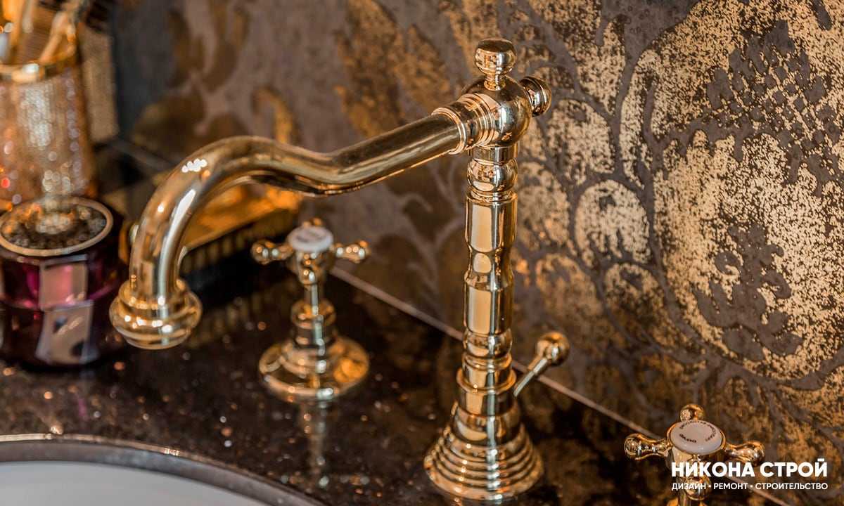 ванная комната с золотыми отливами — изысканная и элегантная. В качестве элемента можно использовать золотую умывальную зону