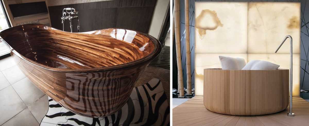 Дерево в современных ванных помещениях используется везде. Это не только отделка пола и стен. Из этого материала даже выполняются раковины и столешницы для них.