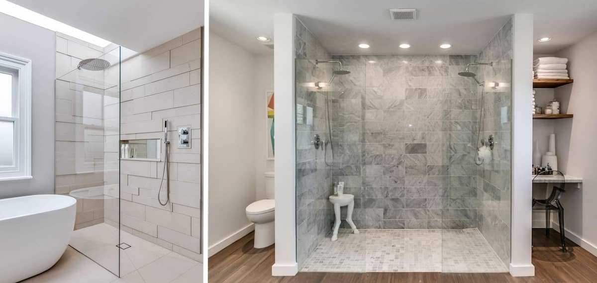 - Вместо обычной ванны можно организовать душ без кабины по ширине помещения со стеклянной перегородкой.