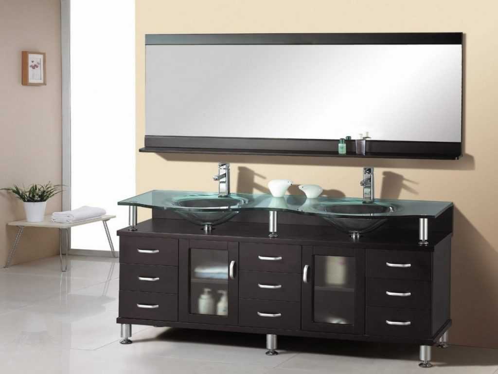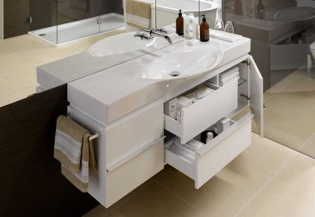 Если данный вид мебели предполагается разместить в ванной, следует обратить внимание на такие детали, как материал (он должен быть влагостойкий), форму и размеры столика. Удобный вариант в ванную комнату должен обязательно иметь большое зеркало, ящички для хранения личных принадлежностей, при этом не быть громоздким